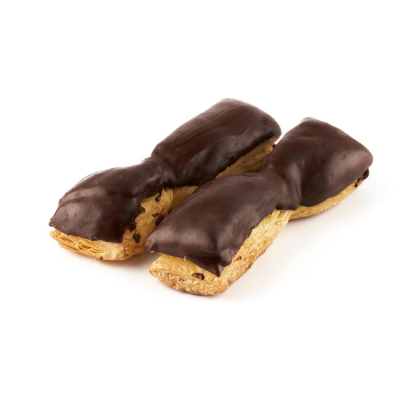 Lazo de hojaldre mantequilla, cubierto de chocolate.